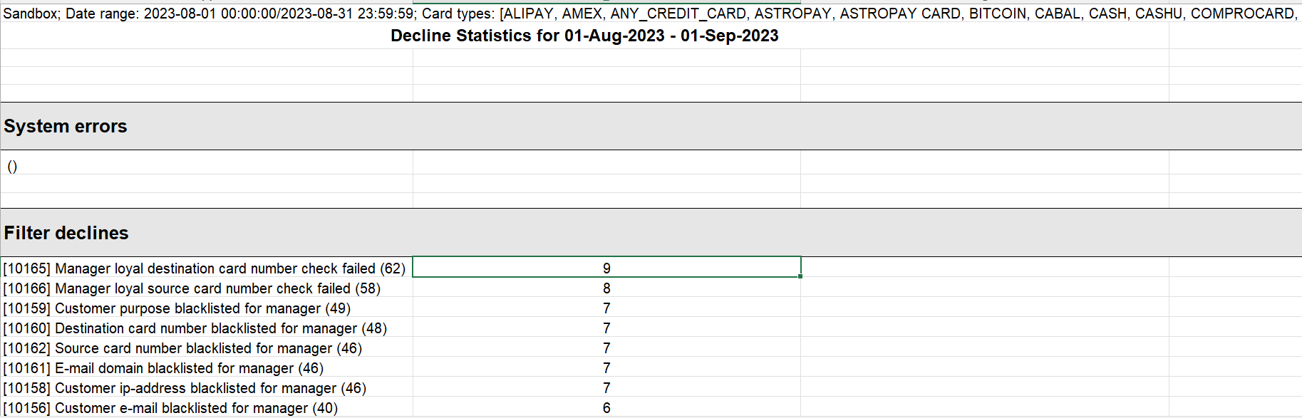 This report allows to get statistics on rejected transactions, which are divided into the following groups: rejected by the acquiring bank, rejected by internal fraud system and rejected due to an internal error.