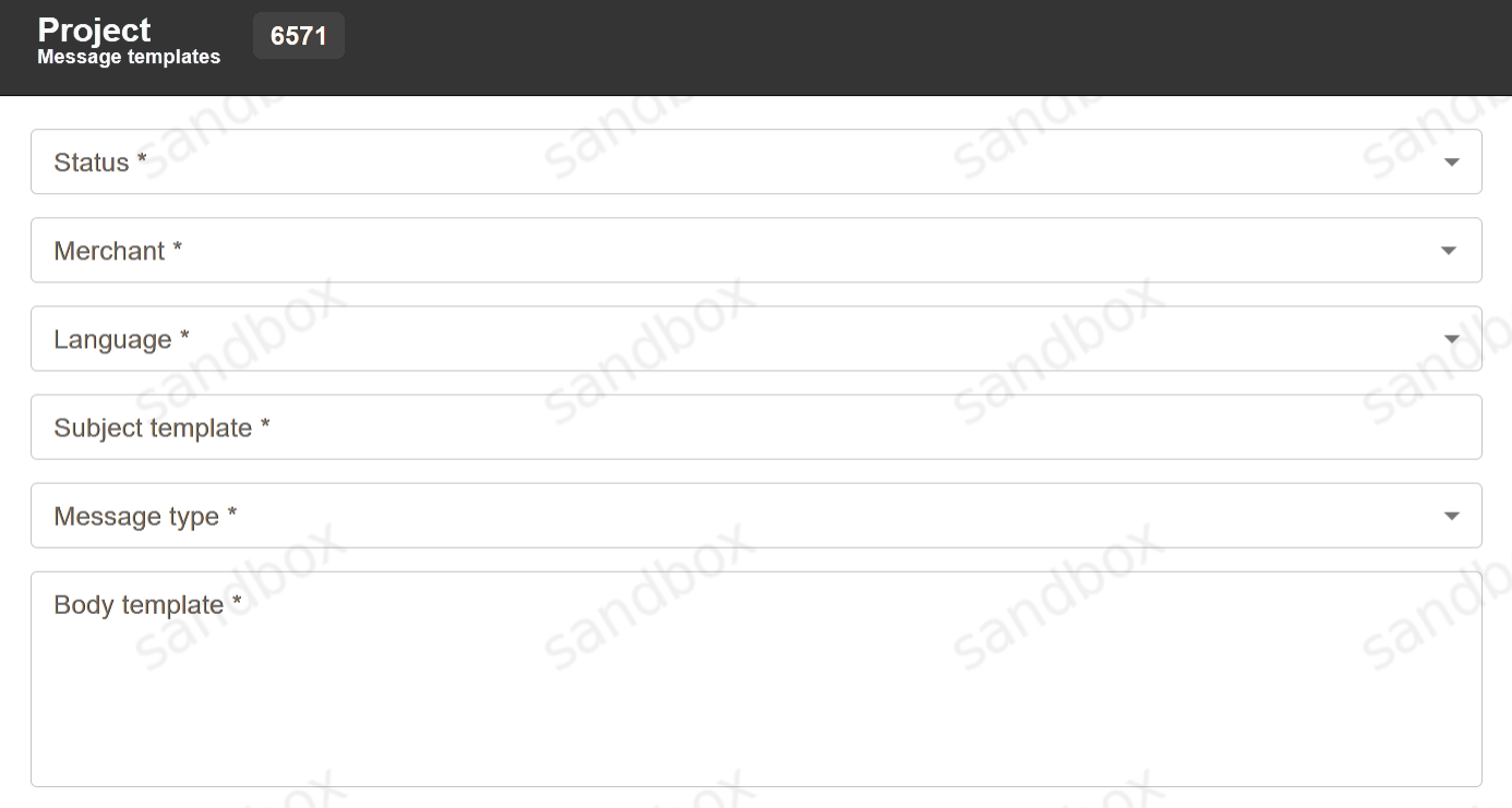 Message templates can be used to send SMS or E-mail messages to customer after each successful transaction. Merchant must provide their message server credentials to Fortechlab support manager in order to send such messages from merchant address. Templates are created using the Template button. After pressing it, a window with new template details will open: