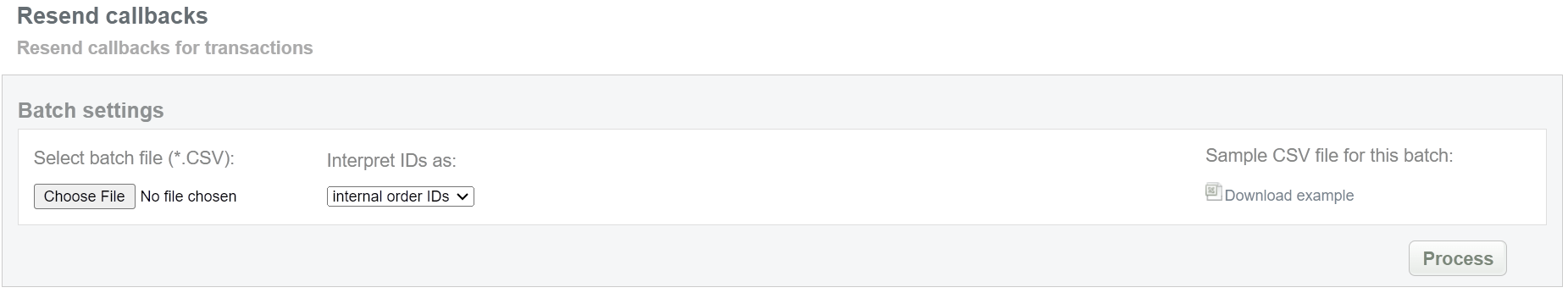 This batch operation can be useful if information on the final status of transactions is available in Fortechlab system and for some reason is not available in the Connecting Party system. Collect the order IDs, assigned by Fortechlab system to the CSV file and upload it to send new callback notifications. An example of CSV file for upload is available on the same screen.