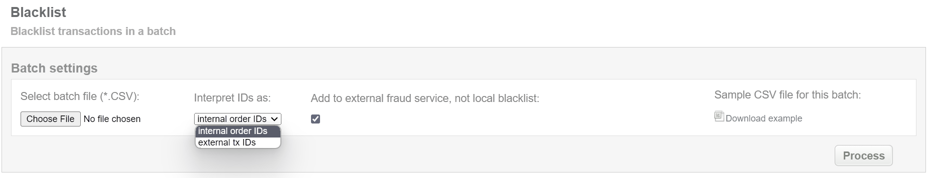 This batch operation, in according to specified input, puts cards in blacklist or external fraud system if such is set up. Collect the order IDs, assigned by Fortechlab system to the CSV file and upload it to blacklist card of selected transactions. An example of CSV file for upload is available on the same screen.