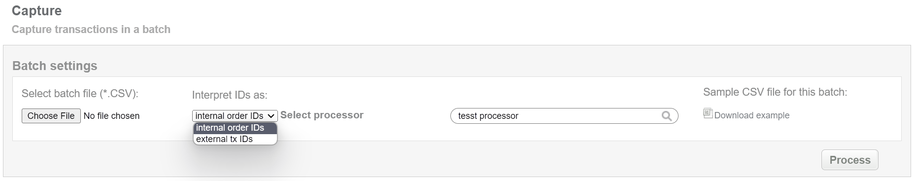 This batch operation can be useful for deducting the locked amount from preauth transactions (preauth should be in approved final status) in according to specified input. Collect the order IDs, assigned by Fortechlab system to the CSV file and upload it to make capture of selected transactions. An example of CSV file for upload is available on the same screen.