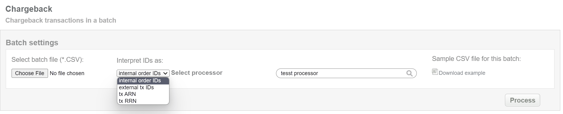 This batch operation can be useful if for some reason reversal was not made to prevent a chargeback and creating chargeback transaction according to specified input is needed. Collect the order IDs, assigned by Fortechlab system to the CSV file and upload it to make chargebacks for selected transactions. An example of CSV file for upload is available on the same screen.