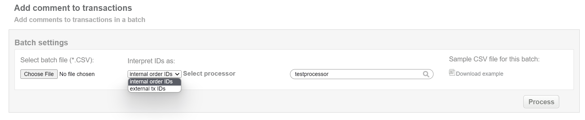 This batch operation can be useful for adding a or an additional comment to transactions in according to specified input. Collect the order IDs, assigned by Fortechlab system to the CSV file and upload it to add comment for the selected transactions. An example of CSV file for upload is available on the same screen.