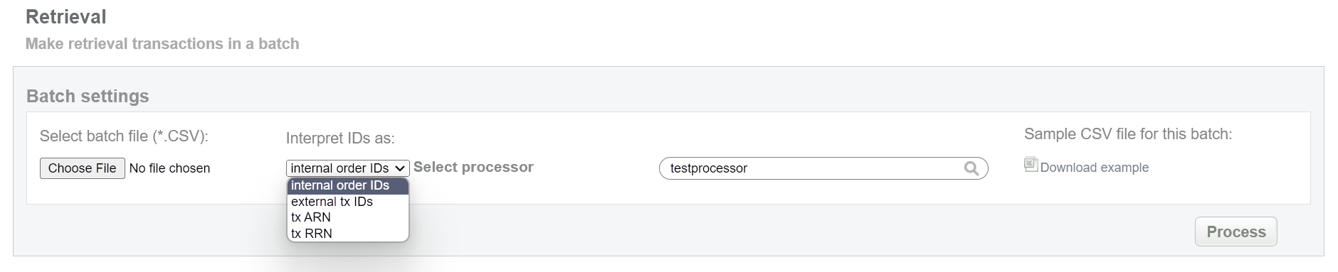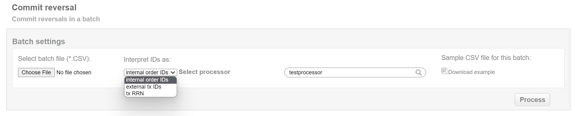 This batch operation re-sends reversal request for pending reversals in according to specified input. Collect the order IDs, assigned by Fortechlab system to the CSV file and upload it to make reversal of selected transactions. An example of CSV file for upload is available on the same screen.