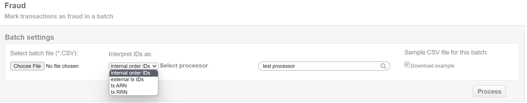 If Connecting Party suspects transaction to be fraudulent, then this batch operation can be useful for marking transactions as fraud in according to specified input. Collect the order IDs, assigned by Fortechlab system to the CSV file and upload it to mark selected transactions as fraud. An example of CSV file for upload is available on the same screen.