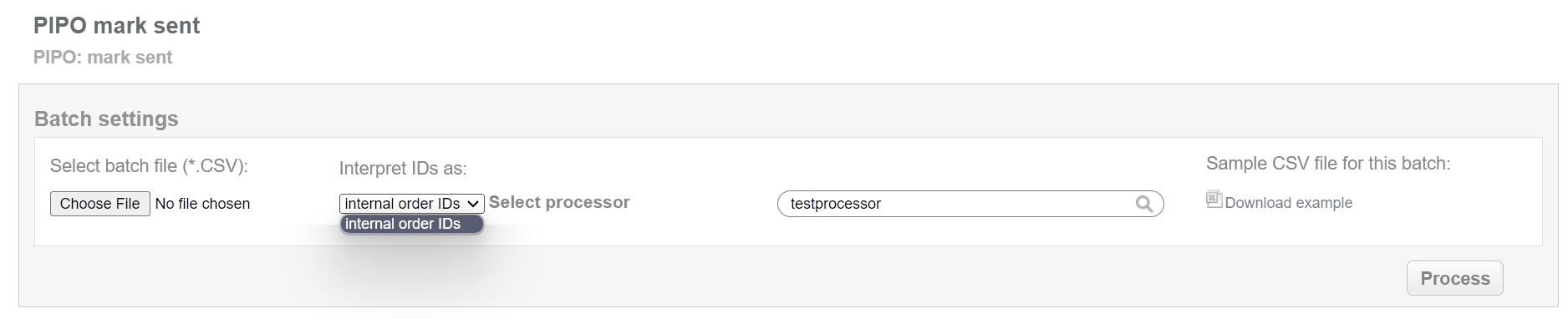 This batch operation allows to mark pending bank transfer as sent (but not received yet). This status equals to “processing” for preauth transaction. Collect order IDs, assigned by Fortechlab system and enter all information to the CSV file and upload it to mark PIPO payments as sent. An example of CSV file for upload is available on the same screen.