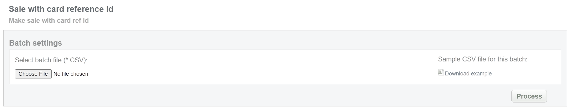 This batch operation can be useful for initiating sale without any card information using only card reference ID. Collect the Endpoint and Card reference IDs, assigned by Fortechlab system and enter all information to the CSV file and upload it to initiate sale transactions with card reference ID. An example of CSV file for upload is available on the same screen.