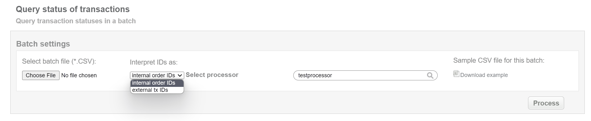 This batch operation can be useful for requesting status of transactions (doesn’t matter in what status) in according to specified input. Collect the order IDs, assigned by Fortechlab system to the CSV file and upload it to request status of the selected transactions. An example of CSV file for upload is available on the same screen.