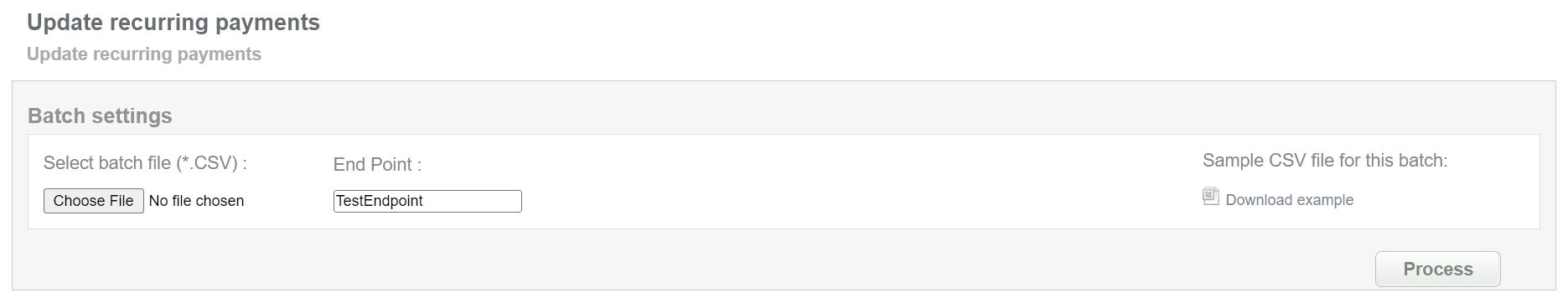 This batch operation can be useful for updating recurring payments (new customer data and etc.) for transactions that require regular debits with the same data. Collect the recurring order IDs, assigned by Fortechlab system and enter all information to the CSV file and upload it to update recurring payments information. An example of CSV file for upload is available on the same screen.