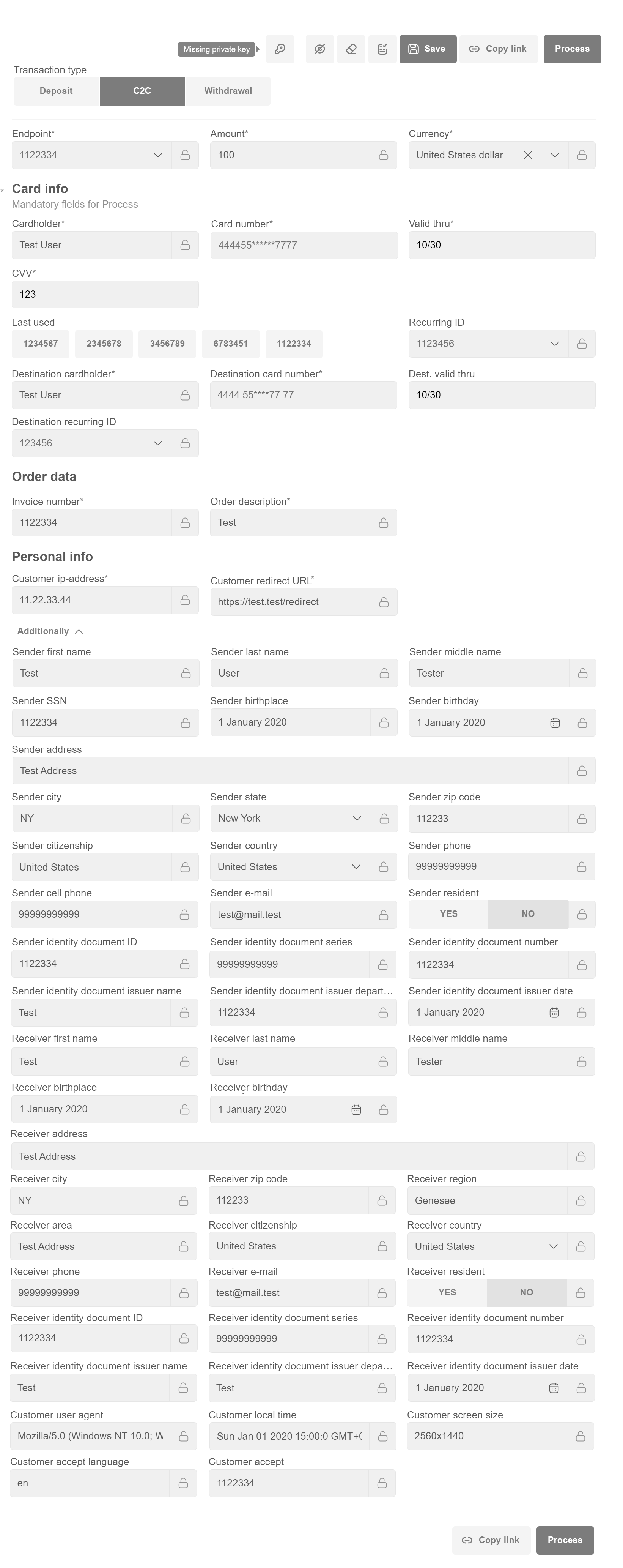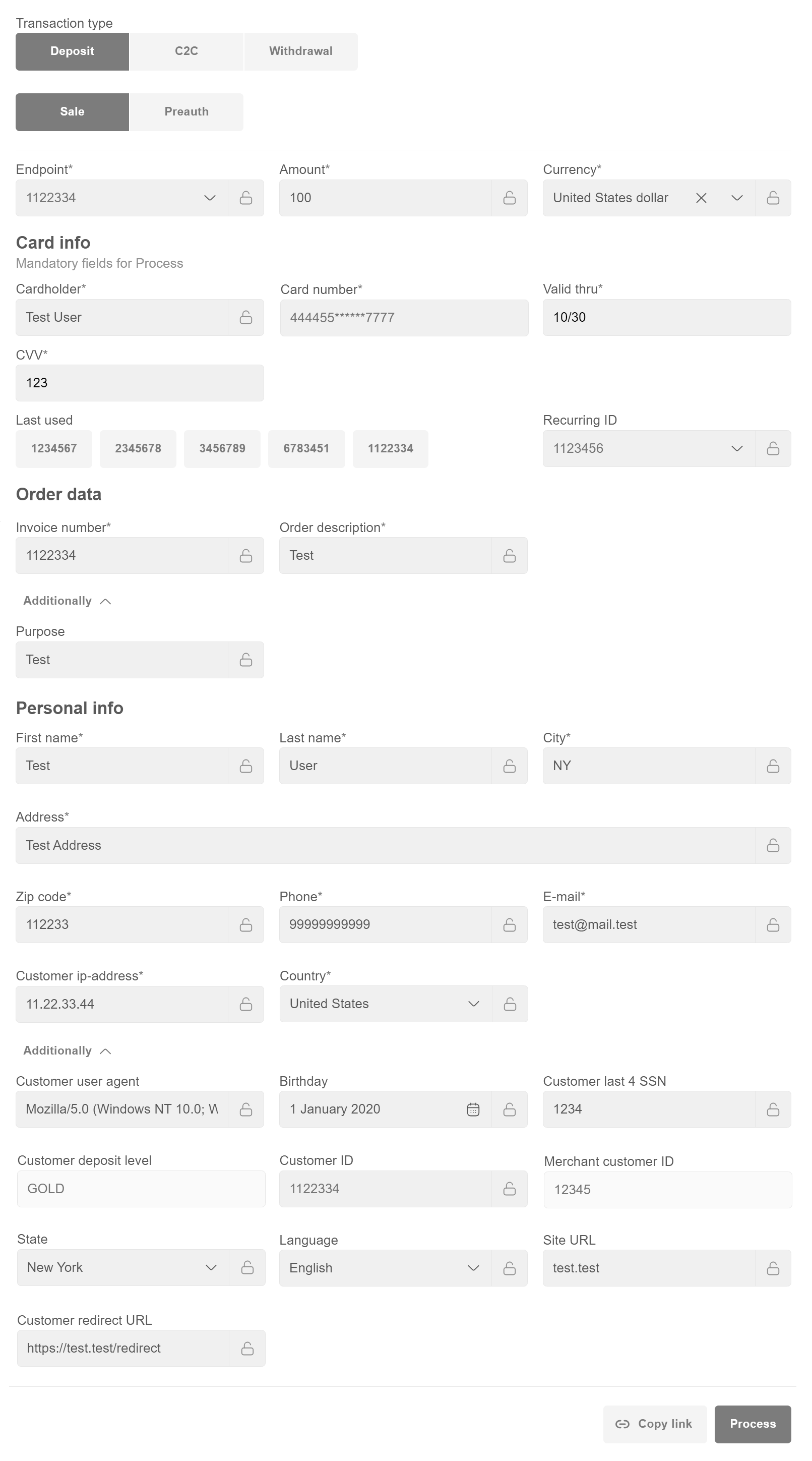 When filling in the Customer ID field, Personal info (First name, Last name,City, Address, Zip code, Phone, E-mail, Country) sections will be filled in automatically.