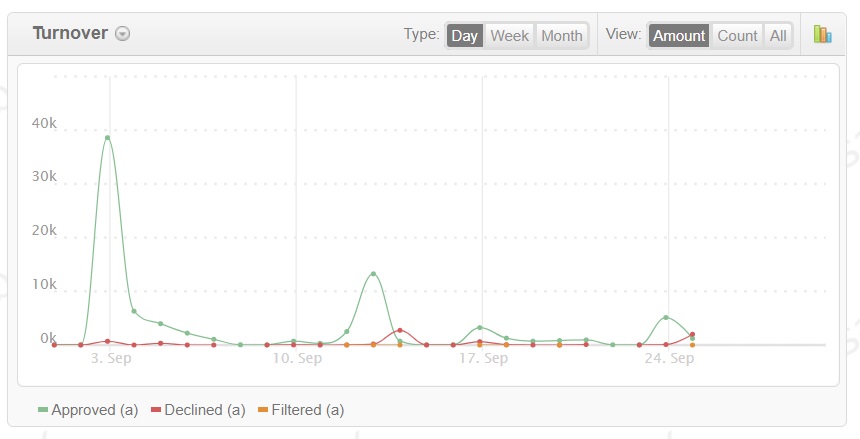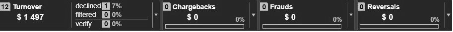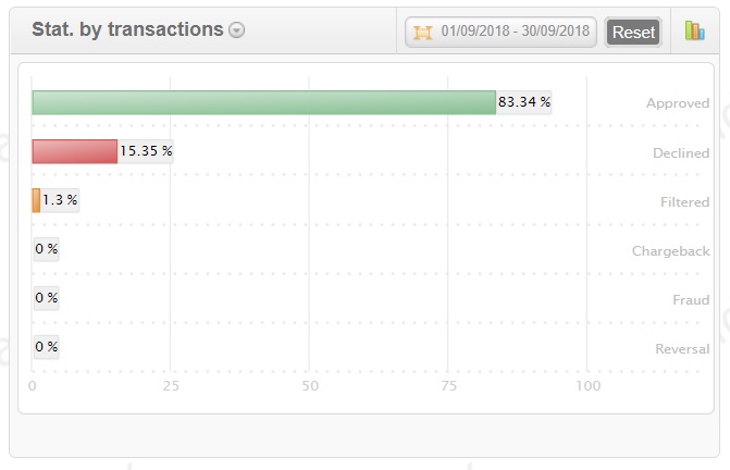 button: the ratio by volume of transactions or by amount of payments, as well as by type of transactions (sale, capture, transfer, etc). Fortechlab Payment Gateway also displays statistics on negative activity and earnings.
